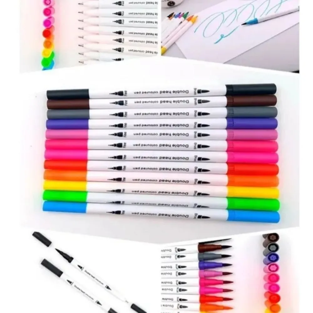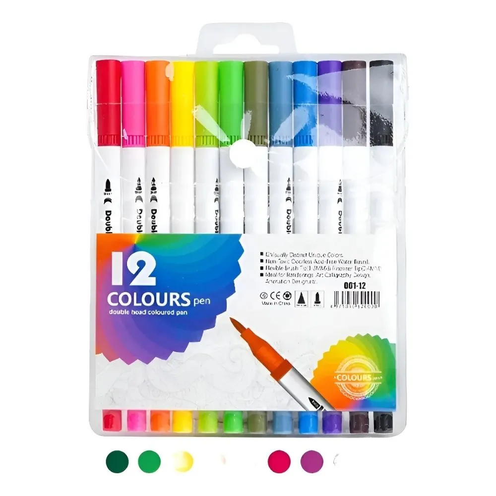 Set de bolígrafos doble cabeza con punta brush y fineliner, ideal para lettering, caligrafía, dibujo artístico, bullet journal y escritura creativa. Incluye 12 piezas en 12 colores vibrantes, con tinta suave, secado rápido y trazos precisos. Perfecto para estudiantes, diseñadores, ilustradores y amantes del arte. Material resistente, cómodo y versátil para uso profesional o creativo.