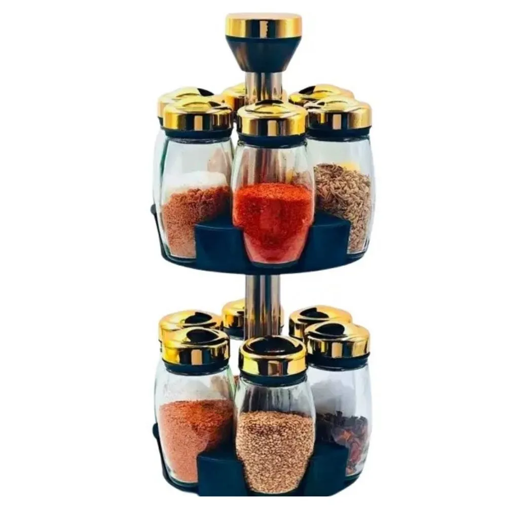 Especiero Giratorio 360° de 2 Niveles con 12 Frascos de Vidrio | Organizador de Cocina – Dorado