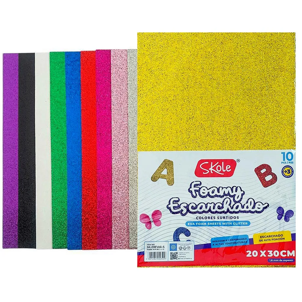El foami Skole escarchado en colores surtidos es ideal para manualidades, proyectos escolares, decoración y trabajos creativos. Cada paquete incluye 10 piezas de foami escarchado con un tamaño de 20×30 cm y un grosor aproximado de 1.8 mm, ofreciendo resistencia y flexibilidad para un fácil manejo y corte.