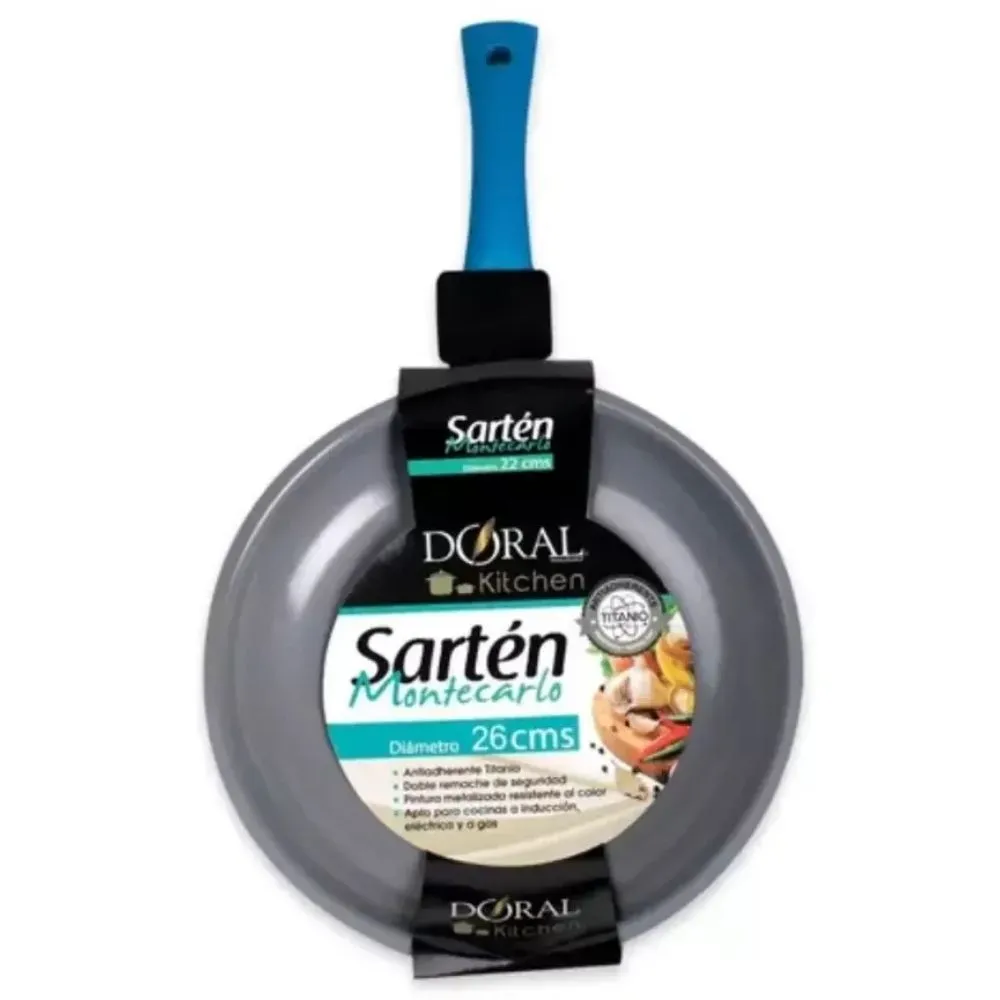 La sartén Doral de aluminio con fondo de titanio de 26 cm es ideal para quienes buscan durabilidad, excelente cocción y diseño moderno. Su capacidad de 2,5 litros permite preparar una gran variedad de recetas, desde salteados y carnes hasta verduras y platos familiares.