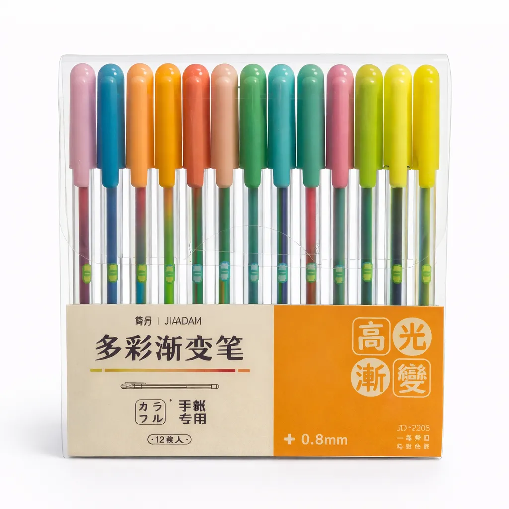 El set de 12 bolígrafos gel multicolor degradado es ideal para quienes buscan una escritura creativa y llamativa. Cada bolígrafo cuenta con tinta de efecto degradado, que combina varios colores en un solo trazo, perfecta para notas, lettering, journaling, dibujo y decoración.