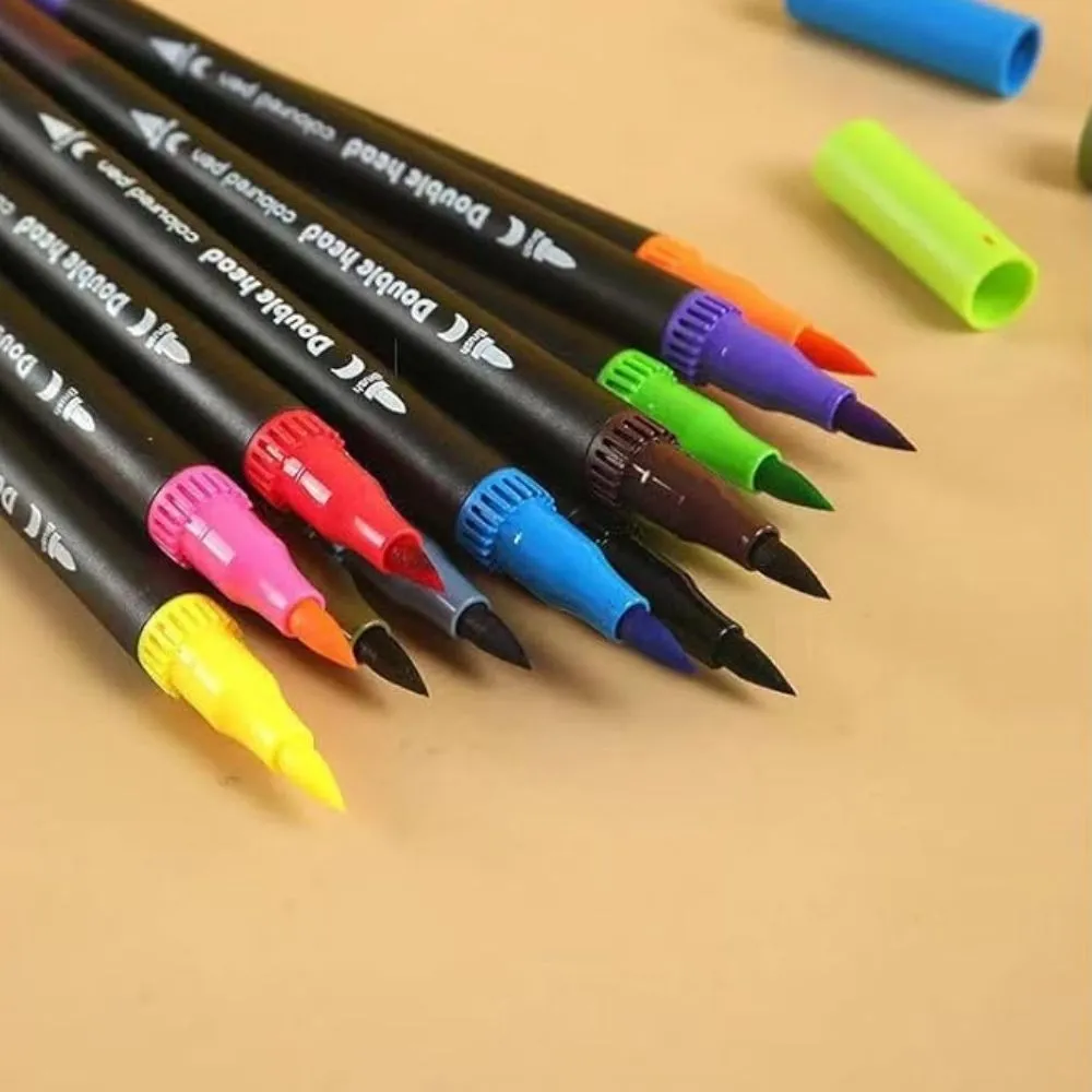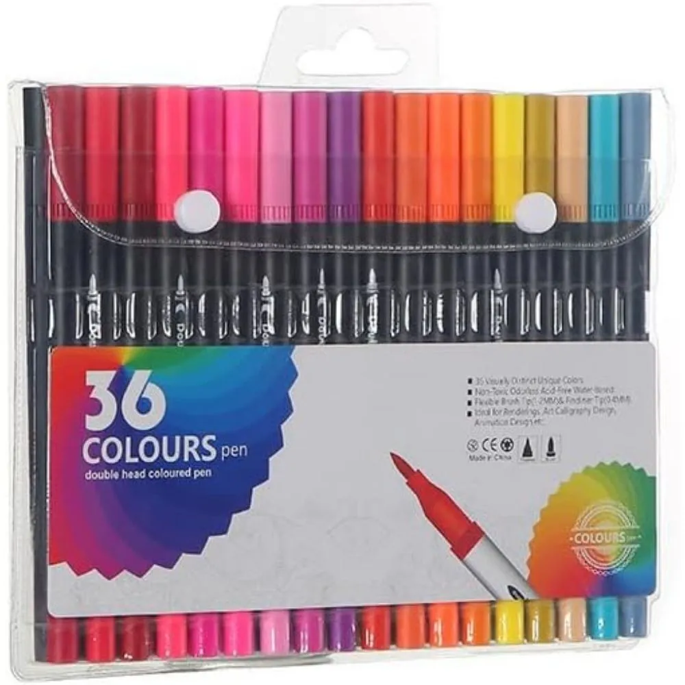 Dale vida a tus ideas con este set de 36 plumones de colores doble punta, ideal para lettering, dibujo, ilustración, bullet journal y caligrafía. Cada marcador cuenta con una punta brush flexible de 1–2 mm para trazos suaves, degradados y lettering creativo, y una punta fineliner de 0.4 mm perfecta para detalles precisos, contornos y escritura fina.