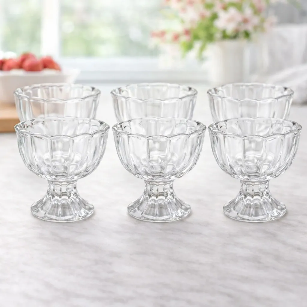 Set de 6 copas de helado de 7 cm, ideales para servir helados, postres, gelatina, mousse o frutas. Elaboradas en vidrio resistente, combinan diseño clásico y durabilidad, perfectas para el uso diario en el hogar, restaurantes o cafeterías. Su tamaño compacto las hace prácticas, fáciles de lavar y reutilizables, aportando un toque elegante a cualquier presentación.