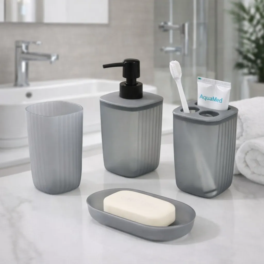 Set de Baño 4 Piezas | Dispensador, Vasos y Jabonera | Diseño Moderno – Gris