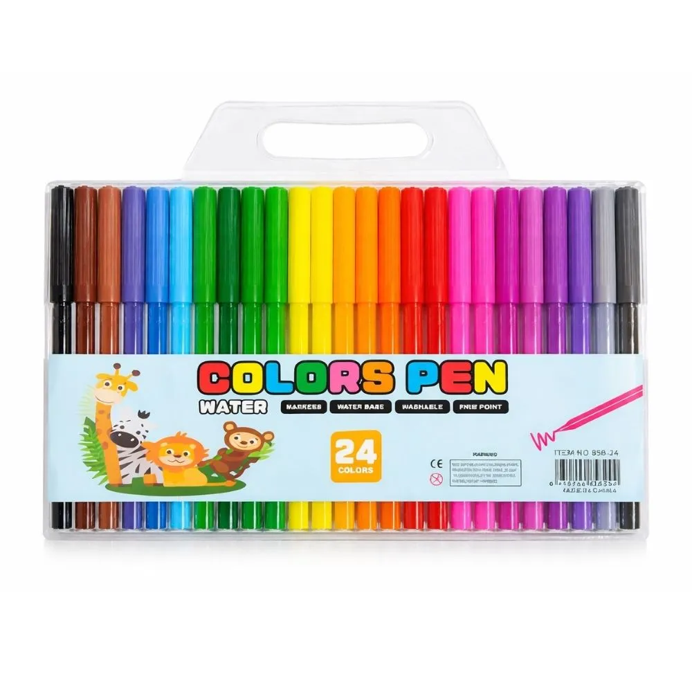 Set de plumones de colores de 24 unidades, ideales para uso escolar, artístico y recreativo. Estos marcadores base agua cuentan con punta fina, lo que permite realizar trazos precisos, escribir y colorear con facilidad.