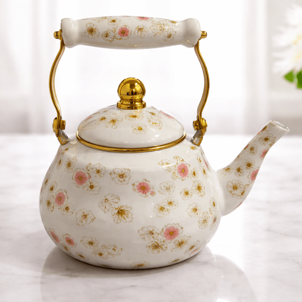 Tetera enlozada de 2 litros con recubrimiento enamel resistente al calor. 23 x 17 cm diseño clásico, duradera y fácil de limpiar. Ideal para uso diario en cocina.